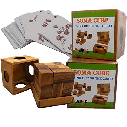 There's dozens of retailers selling Soma Cubes every now and then, so you might as well get one with flash cards for building models. The Soma Cube is a puzzle invented by a Dutch polymath name of Piet Hein in 1933, never patented. It's a seven piece puzzle that assembles into a 3x3 cube, but that's just the beginning. It can also build a near-infinite variety of shapes, from the geometrical to the expressionistic. This is the king of desktop wooden puzzles. I've been into Soma puzzling since reading about it in Martin Gardner's old Scientific American column, at which time I couldn't find where to buy one so I made one myself - all you need is 27 wooden blocks and some glue.