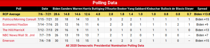 Biden is our front-runner. Every poll gives him a landslide spread, with just a couple contenders nibbling at his ankles. Heir to the Obama legacy, he's the closest thing we have to a Kennedy within a rock's throw of the White House. He's more conservative than the late John McCain, but that's what passes for an electable Democrat these days. Polling at 28.6, more than double the second-place runner, so the faster everybody else drops out, the better. Of course, that would make good common sense, so that's the opposite of what's going to happen.