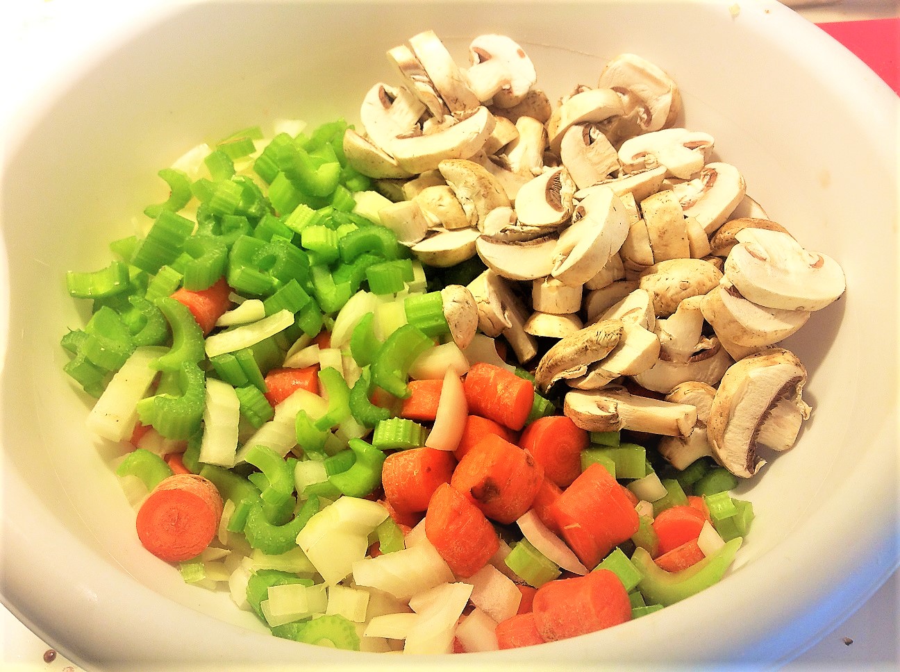 First, we need to prepare our veggies for chopping, as necessary, by rinsing, peeling, trimming, discarding roots, etc.