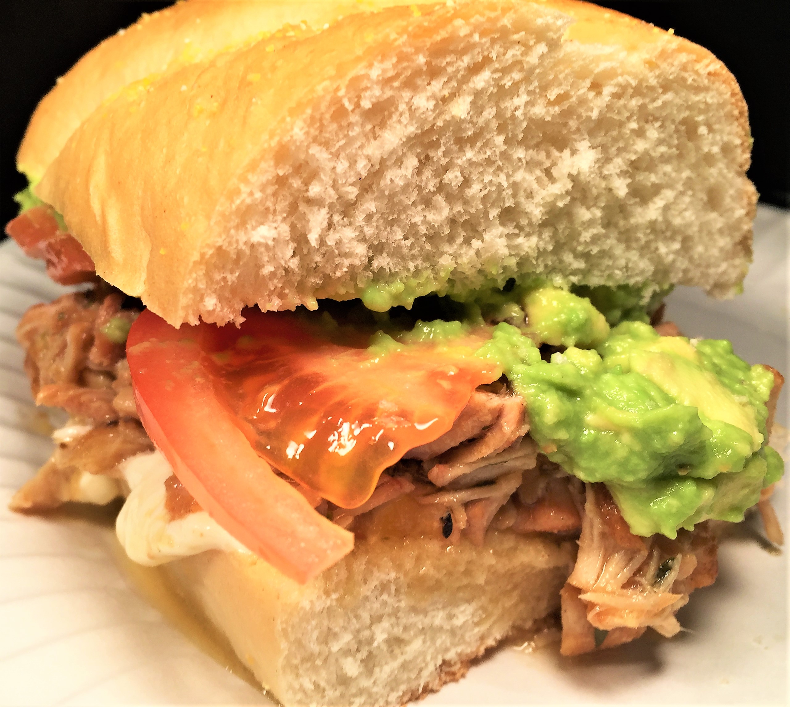 After pork has rested 5 minutes, slice it very thinly against the grain, then chop. Pile the chopped pork onto warmed rolls (bottom slice) spread with mayo, and brush with reduced braising liquid. Add a big dollop of avocado and top with tomato on top slice. Close sandwich.