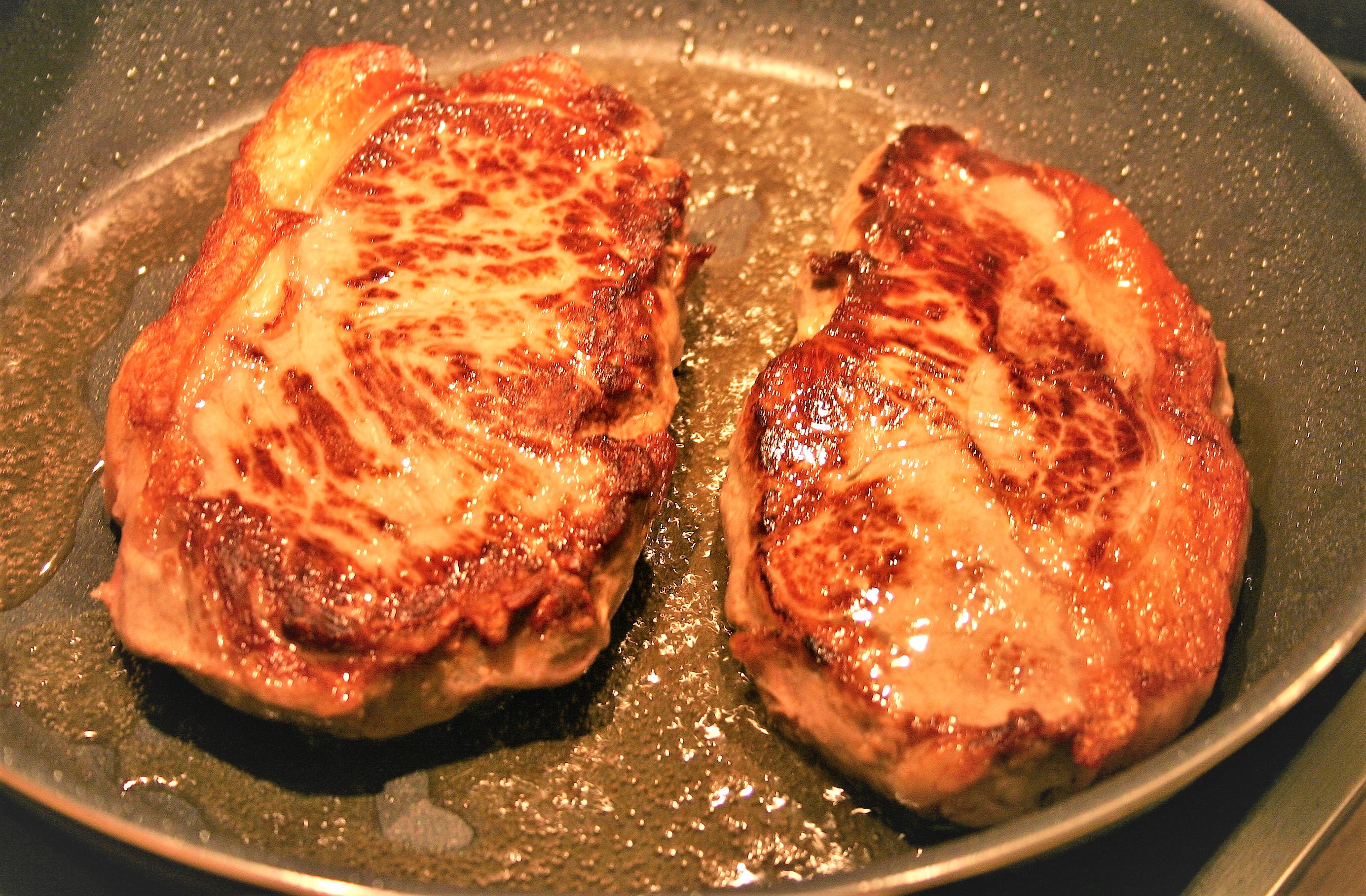 In a large skillet, over high heat, brown pork steaks on both sides in 1tbs ghee and 1 Tbs. grapeseed oil.