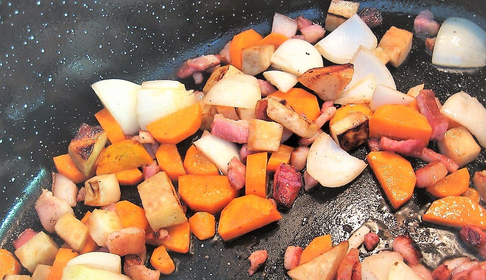 Add remaining ghee and oil to pan, along with the carrots, onion, garlic, and celery. Saute until veggies start to soften (I like to add any "fatty bits" I've trimmed from the pork, but that's optional.)