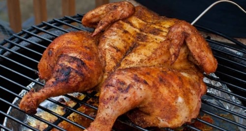 Place the chicken skin-side up on the indirect side of the grill with the legs facing the hotter side. Cover and cook until an instant-read thermometer inserted in the thickest part of the thigh (avoiding the bone) reads 150 to 160 degrees F (almost cooked through), about 50 minutes.