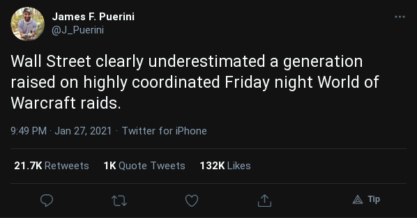 These were not Wall Street market analysts in pinstripe suits. These were kids at home in their jammies with a plate of chicken tendies at their elbow, playing the stock market exactly like they would play any other cooperative online game, from Old