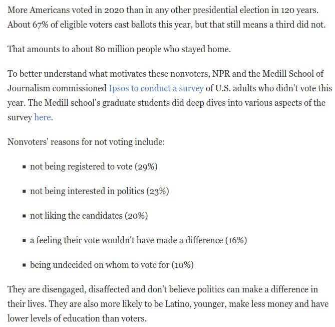Recall the point I keep circling back to again and again. A huge chunk of Americans don't even vote. I used