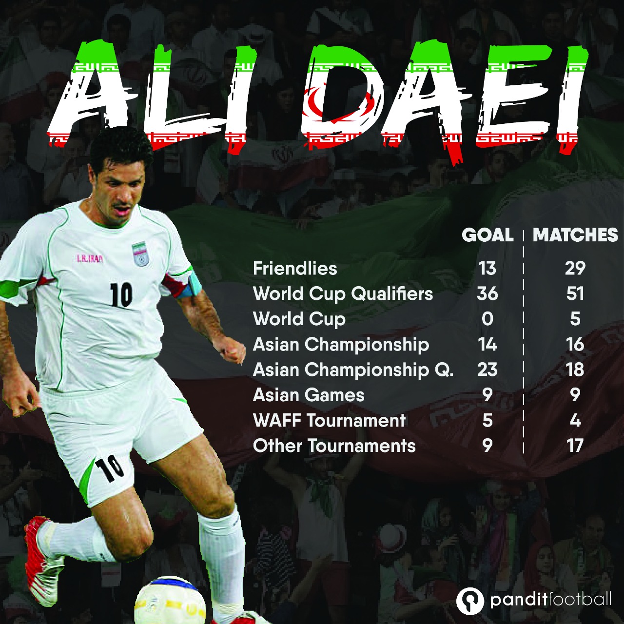 Ali Daei yang kini sudah pensiun sebagai pemain sepak bola itu berhasil mencetak 109 gol dalam 149 penampilannya bersama timnas Iran. Pemain yang paling mendekati rekornya adalah striker baru milik Juventus, Cristiano Ronaldo, yang di mana dirinya telah berhasil mencetak 85 gol untuk timnas Portugal dari total 154 penampilannya.