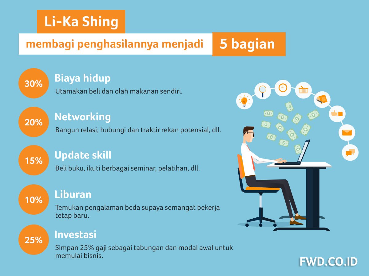 Saat menerima gaji bulanan, akan lebih baik jika kamu membagi-baginya ke dalam beberapa kategori. Milyalder asal Hongkong, Li Ka Shing memberikan caranya untukmu. Pertama, bagi 30 persen dari gaji bulananmu untuk kebutuhan sehari-hari. Yang kedua, bagi 20 persen dari gajimu untuk keperluan sosial dan pertemanan, bisa juga untuk diberikan kepada orang tua dan sedekah. Ketiga, 15 persen dari gajimu alokasikan untuk biaya pendidikan, entah untuk kursus atau pun melanjutkan pendidikan tinggi. Keempat, sisihkan 10 persen dari gajimu untuk liburan. Sementara bagian yang kelima, alokasikan 25 persen dari gajimu untuk berinvestasi, atau bisa juga untuk cicil rumah atau pun kendaraan bermotor.