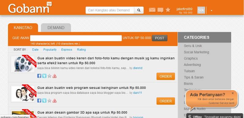 Situs Freelance yang satu ini cukup unik karena menggunakan bahasa gaul. Anak Jakarta Barat pasti kenal betul arti kata Gobann. Gobann ini artinya 50 ribu. Di situs ini kalian bisa menjual jasa kalian dengan awal kata “gue akan.. untuk 50 ribu”. Contoh, “gue akan edit foto kalian untuk 50 ribu”. Situs ini masih aktif sampai sekarang. Kalian bisa juga menawarkan pekerjaan di situs ini.