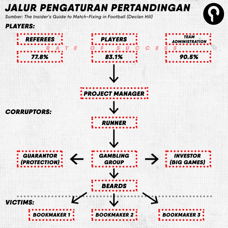 Secara umum, praktik match-fixing akan melibatkan administrator tim (presiden, manajer, pelatih, dll), pemain, hingga wasit. Kembali lagi menurut Hill, tingkat kesuksesan koruptor dalam mengatur suatu pertandingan akan lebih besar jika dia menyogok administrator tim, dengan persentase 90,5 persen.
