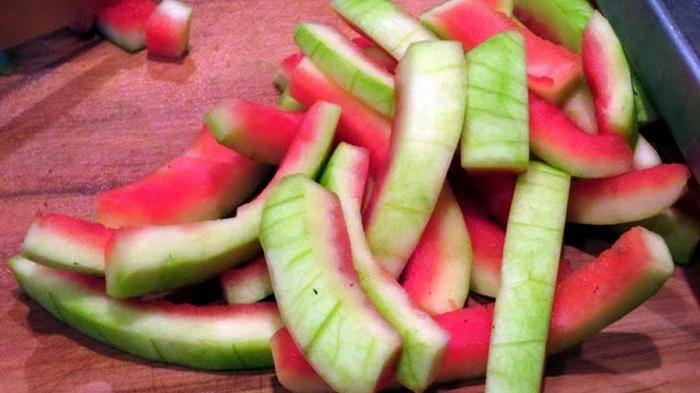 1. Pertama, sisihkan semangka dari daging dan juga kulitnya. Ambilah kulit yang berwarna putihnya.