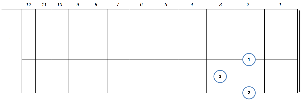 Kalian bisa menggunakan 3 jari saja mengikuti 3 titik hitam tersebut. Jari yang di gunakan bisa jari telunjuk di garis/ titik D (senar 4), jari tengah untuk garis atau titik G (senar 3) yang berada di tengah, kemudian jari manis di garis/titik B (senar 2) yang berada diakhir. Oh iya khusus kunci gitar ini kalian tidak perlu terlalu lurus kalian masih bisa memiringkan sedikit jari-jari kalian hingga membentuk miring namun tetap pada posisi di gambar.
