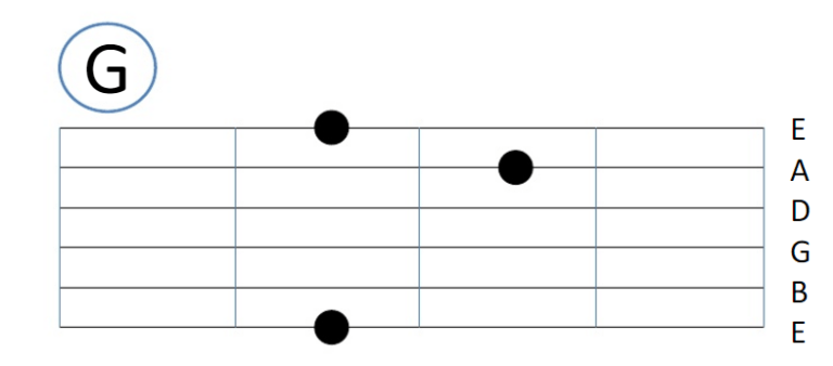 Untuk kunci G kalian bisa memakai dua cara. Yang pertama kalian bisa memakai gambar di atas yaitu jari telunjuk di garis/titik A (senar 5), jari tengah di garis/titik E (senar 6) kemudian jari manis di garis/titik E (senar 1) yang berada paling bawah. Atau cara kedua apabila anda kesusahan anda bisa langsung saja menggunakan jari telunjuk di garis/titik E paling bawah.