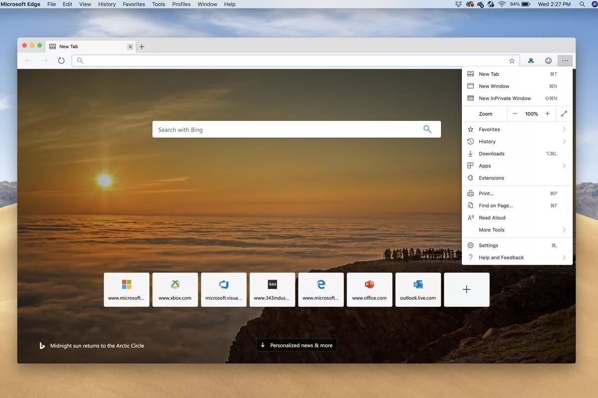 Setelah semuanya telah siap, hal pertama yang akan kamu perhatikan adalah halaman tab baru, yang telah dibawa dari Microsoft Edge yang lama dan telah diubah dengan lebih banyak fitur kustomisasi. Secara default, browser diatur untuk browsing dengan menggunakan layanan Bing, tetapi pengguna dapat mengubahnya di pengaturan jika mereka mau.