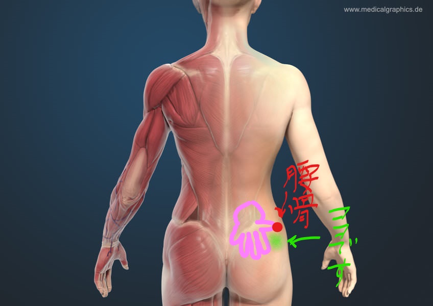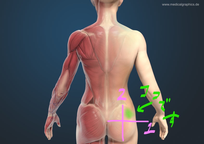 1)注射するお尻り側の手を自然にパーにし、その親指をお尻側の腰骨に充てる。