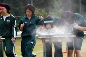 みんな大好き「パン食い競争」!!紐に平行につるされて並んでいるアンパンを、飛び上がって口にくわえてもぎ取り、ゴールする定番の競争です!手を後ろに縛り、大量の小麦粉の中でお父さんが顔を真っ白にしながら飴玉を探す「アメ食い競争」も、見ているだけで楽しかったものでした。でもいつの間にか『不衛生』という理由で、姿を消しました。