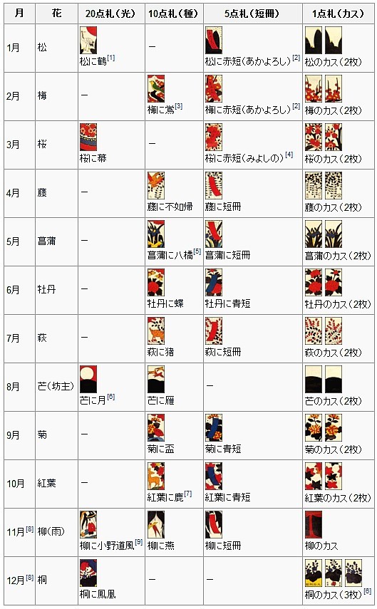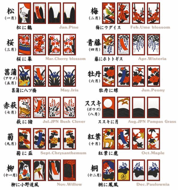 一年を12か月に分け、各月ごとに花鳥風月を取り入れてあり、遊び方は本格的なものから簡単なやり方まで色々あると思いますが、そこまで詳しくない一般の私としては、札の美しさを楽しみ、特定の札で点数を競う程度の楽しみでお正月に子供と親しんでいます。