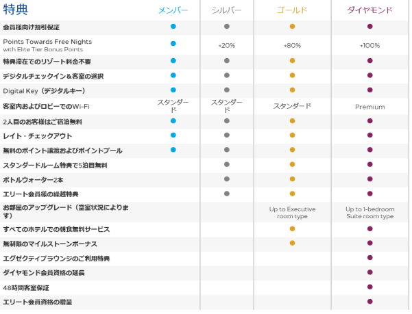 ダイヤモンドになるエグゼクティブラウンジや全ホテル無料朝食付きなどたくさんのサービスがあります。