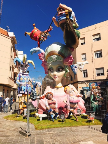 毎年3月15日から19日まで開催されますが、2月後半からすでに街はお祭りモードに包まれます。街のそれぞれの自治体でファジャス(Fallas)と呼ばれる張り子の巨大な人形を道路の真ん中に設置します。この人形は最終日の3月19日深夜に一斉に燃やされますが、700以上のファジャスの中からコンペで優勝したものだけが燃やされずに残り、バレンシアの芸術・科学都市の近くにある「火祭り博物館」で展示されます。
