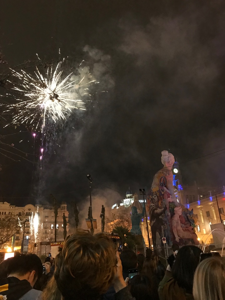 市庁舎広場では、この時間から花火や爆竹がこれでもかというほど打ち上げられ、中心に据えられたファジャスに火が灯されます。このイベントは街中の人が広場に集まるので、近くでファジャスが燃える様子を見たい人は、1時間以上前に広場に行き、場所を確保することをおすすめします。2019年のクレマはあいにくの雨でしたが(300日晴れるというバレンシアなのに!)、それでも迫力満点でした。周りの熱狂具合もすさまじく、日本のお祭りとは一味違う、クレイジーな盛り上がりを感じることができます。