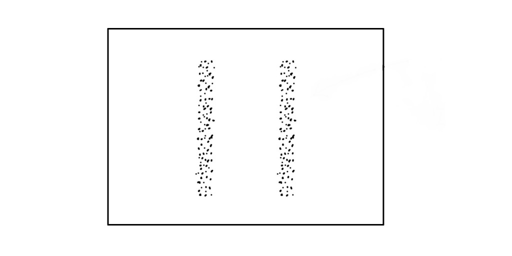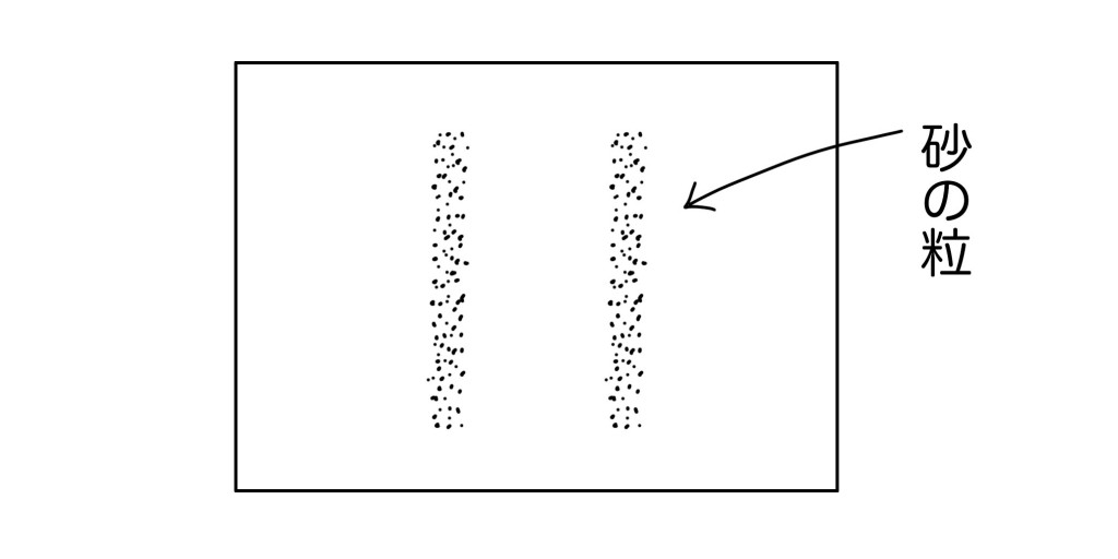 砂粒や小麦粉などの粒子は、スリットを通り抜けると先のスクリーンには2本の線が付きます。これは、物質が持つ一般的な「粒子」としての特性です。