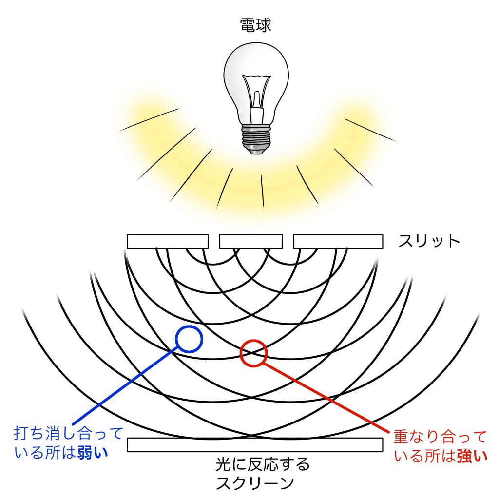 この縞模様は「波」としての特性で、波には起伏があり、山同士(谷同士)が重なり合うと強め合い、山と谷が重なり合うと相殺します。その結果、重なり合ったところは光が当たり、相殺しあったところは影になります。それが、スクリーンに縞模様を生みます。
