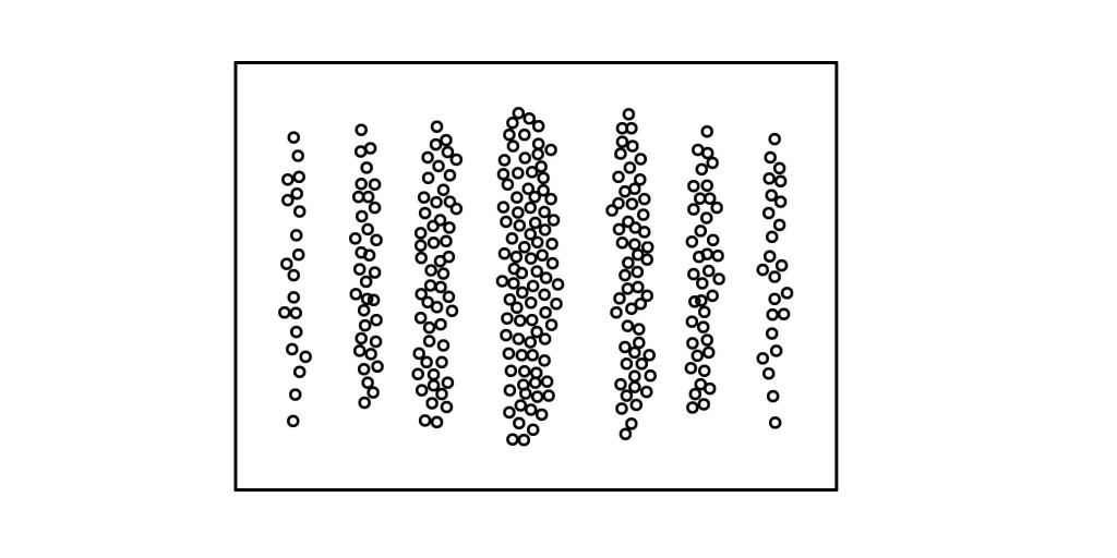 量子がスリットを通り抜けると、光のような波の特性が出ます。実験では量子を一粒ずつ飛ばしていますが、波と同様に増幅と相殺をし、縞模様が出ます。