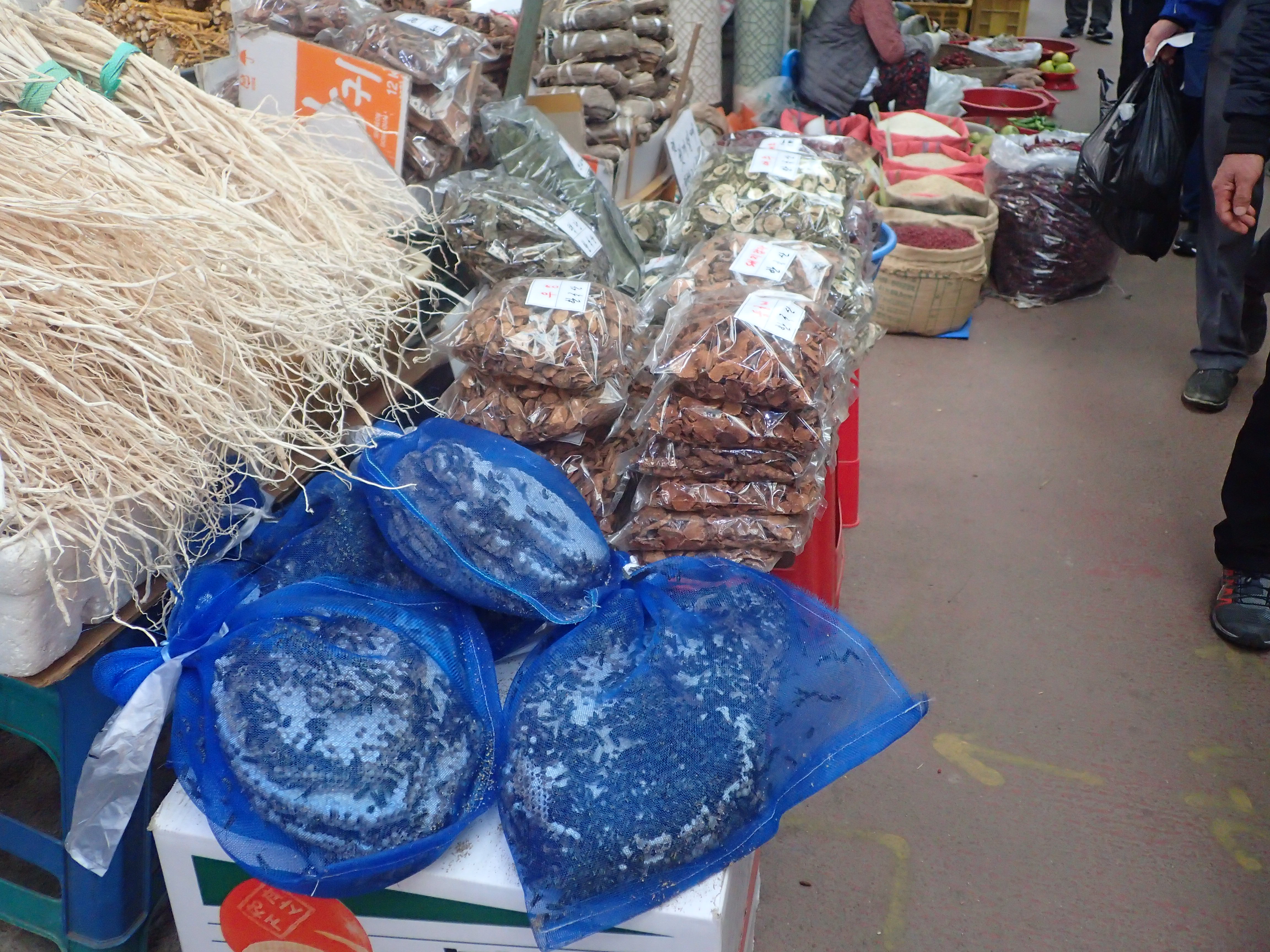 薬用植物売りに紛れて何の惜しげもなく働きバチつきのハチの巣が堂々と売られているのは衝撃の一言でした。まさかこれを食べるのかと思いきやどうも自家養蜂用のようです。なるほど、屋上ではちみつをとろうというわけですね。