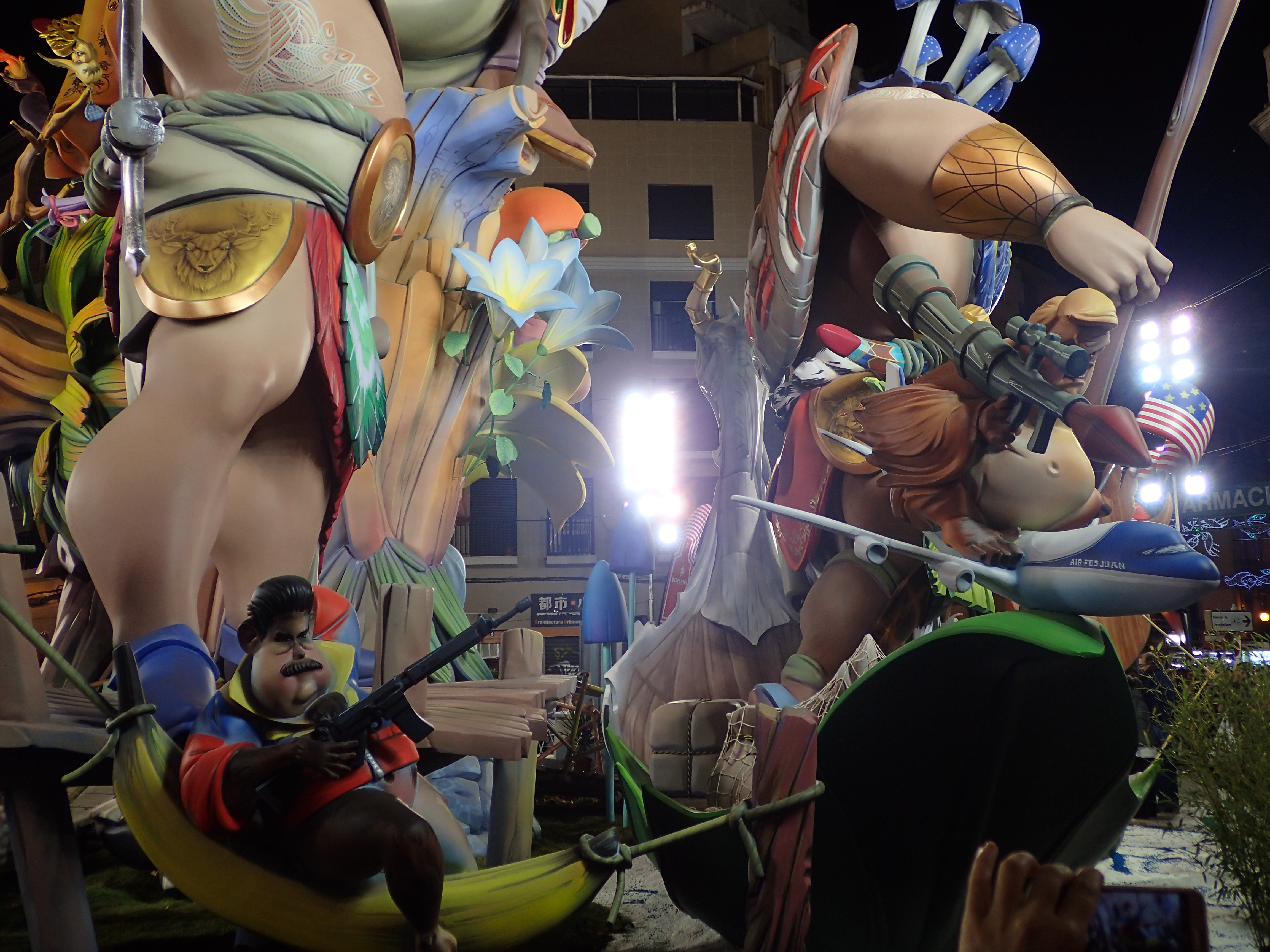 筆者にとっての火祭りの楽しみのひとつとして風刺画ならぬ風刺人形があるのですがあまりに独創的な、でも面白おかしい完成度に笑いをこらえるのもままなりません。この写真を撮影した当時は2017年、当時はただですら関係のよくなかったベネズエラとアメリカの関係が加速度的に最悪になった時で、左にはバナナに座った武装したベネズエラのマドゥーロ大統領と右には重武装したトランプ大統領が映っています。