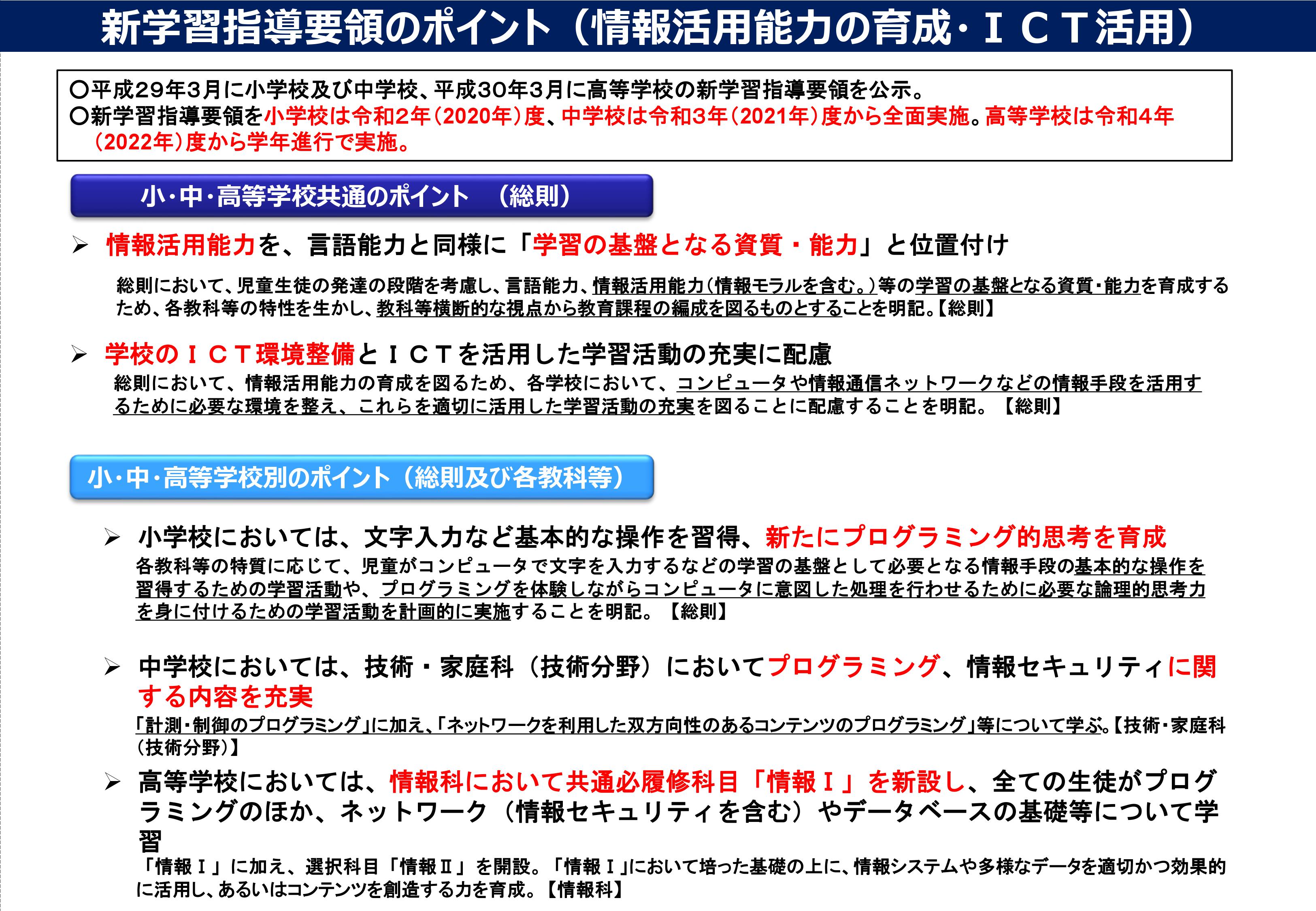 - 高等学校=情報科を新設して「情報Ⅰ」「情報Ⅱ」を開設。プログラミング等の学習を行う