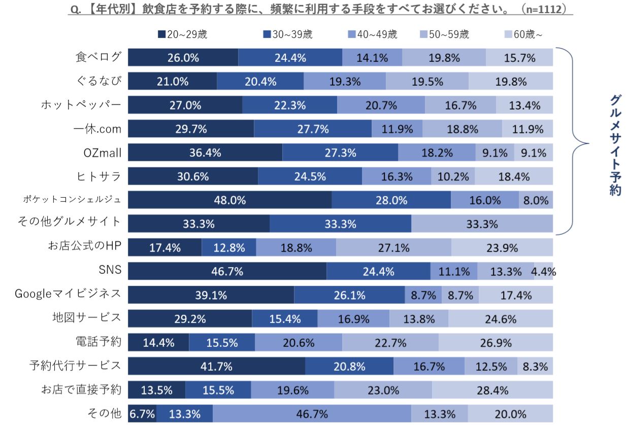 世代別では、20~30代が最も多く、その利用はグルメサイト予約が中心となっています。20~30代が、最も多くグルメサイト予約を利用し、無断キャンセルを行っています。その上、無断キャンセルの回数もこの世代が圧倒的です。ネットでの予約は手軽にできる分、責任においても希薄になってしまうことが考えられます。