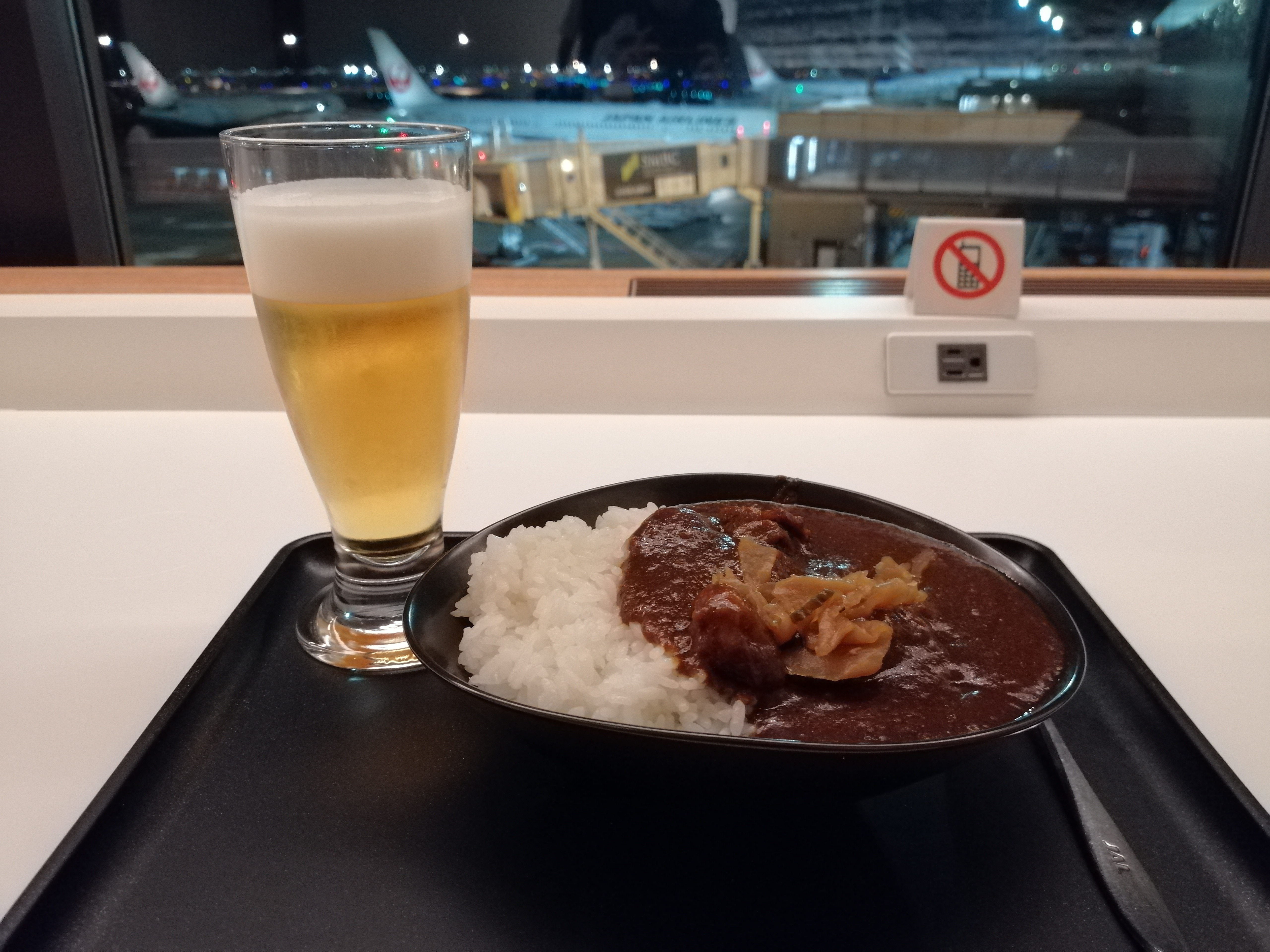 答えは先述したようにJGC会員であることにあるのですが、会員になると利用クラスに関係なくラウンジを使うことができるようになります。とは言え、さすがにファーストクラスラウンジは使えないので今回はSakuraラウンジでカレーを楽しみました。飛行機を眺めながら食べるカレーはおいしいです(笑)。