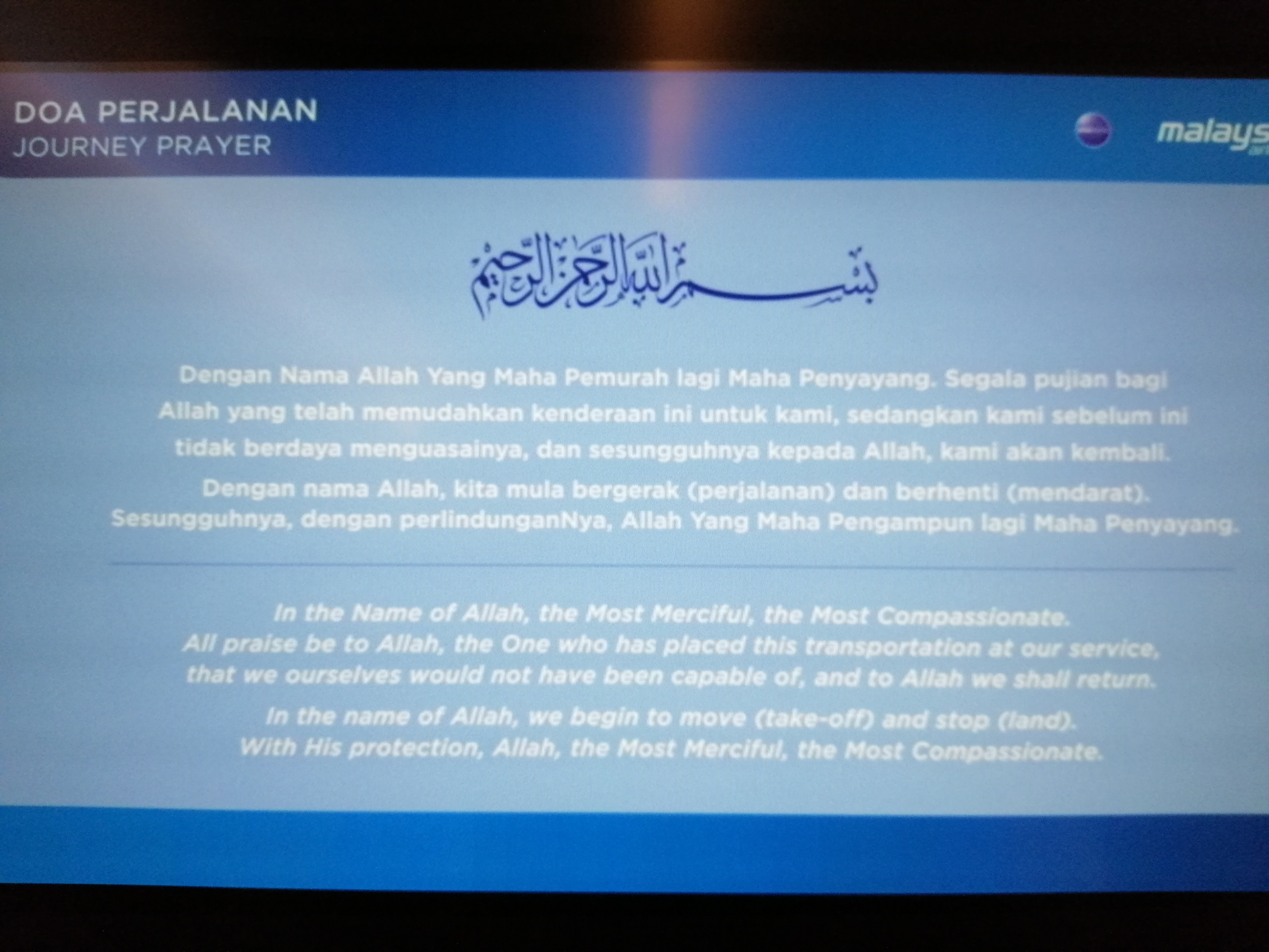 マレーシア航空は安全ビデオが終わると写真のようにJourney Prayer(旅の祈り)が表示されます。