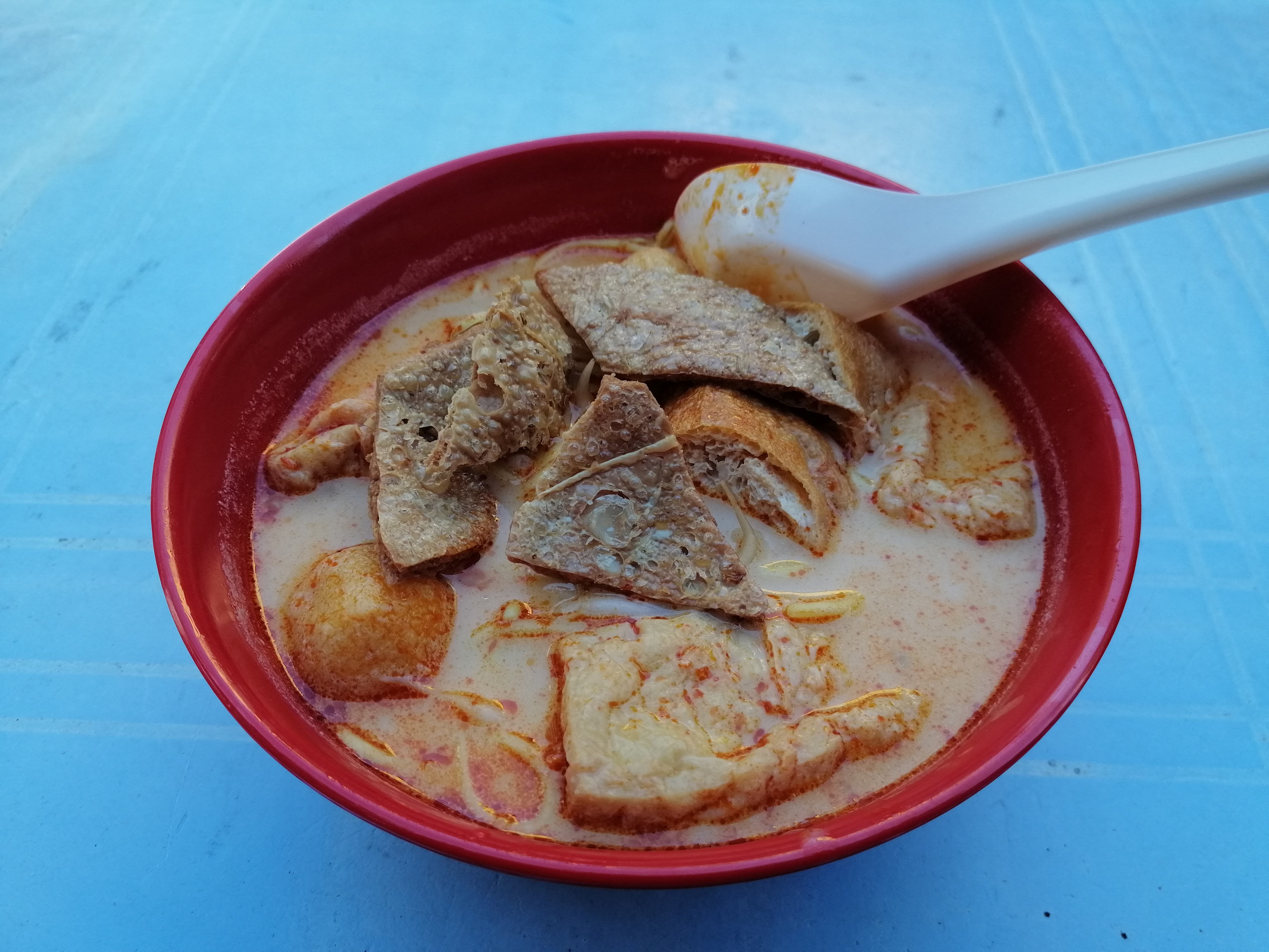 今度はカレーのルーのようなとろみを帯びたスープが特徴なラクサでした。麺はビーフンで、具はというと麩、ゆで卵、もやし、そしてなんと貝まで入っていました!!海鮮好きの筆者には思わぬ朗報です!ココナッツの香りもしつこくなくて優しく広がる感じもたまりません!