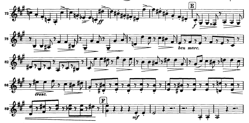 その中でもテンションが上がるのが、1:57~2:00の“シンコペーション(拍の頭ではなく、裏から始まるリズム)”音型です。この3秒間、よく聴くと、「ん・ターッターッターッタ・タ・タ」という音型が聴こえますでしょうか?