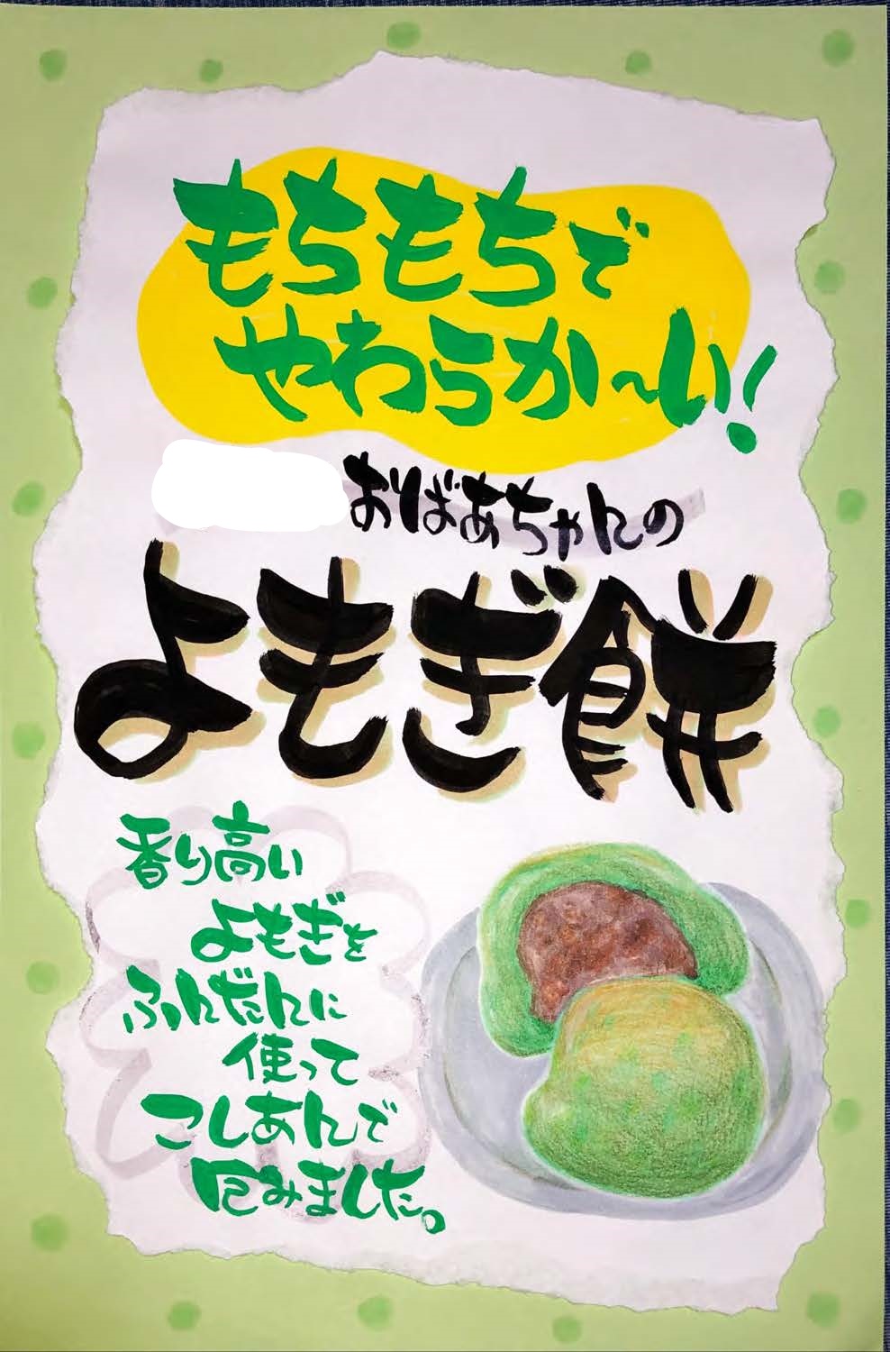 ↑こちらが、今回作成したよもぎ餅手書きPOPです!