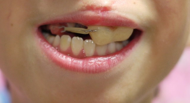 このように前歯にカバーをし、常時装着しているプレート(口蓋閉鎖床)につけているフックと橋渡しをするように直径6mmのゴムをひっかけます。