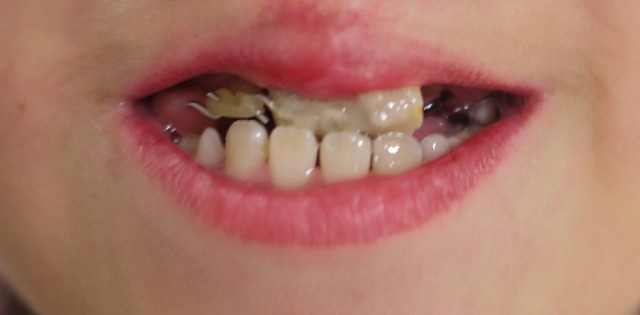 前歯につけていたカバーはなくし、前歯そのものにフックを埋め込んだ土台を接着して同じようにゴムで寄せる矯正に移行。