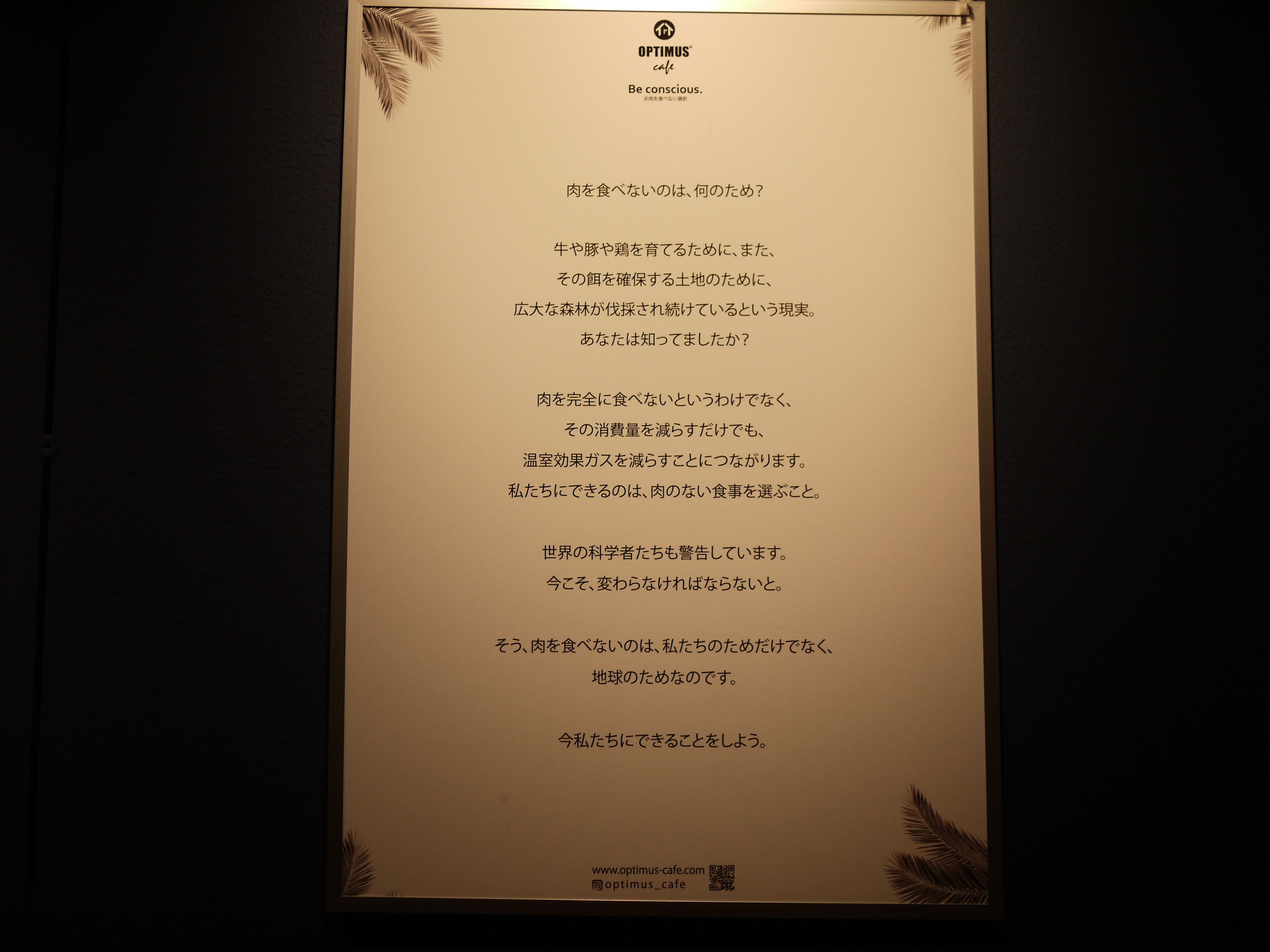 店内を入ると、壁際にこんなパネルが掲げてある。これを見るとOPTIMUS cafeの理念がある程度理解できるだろう。