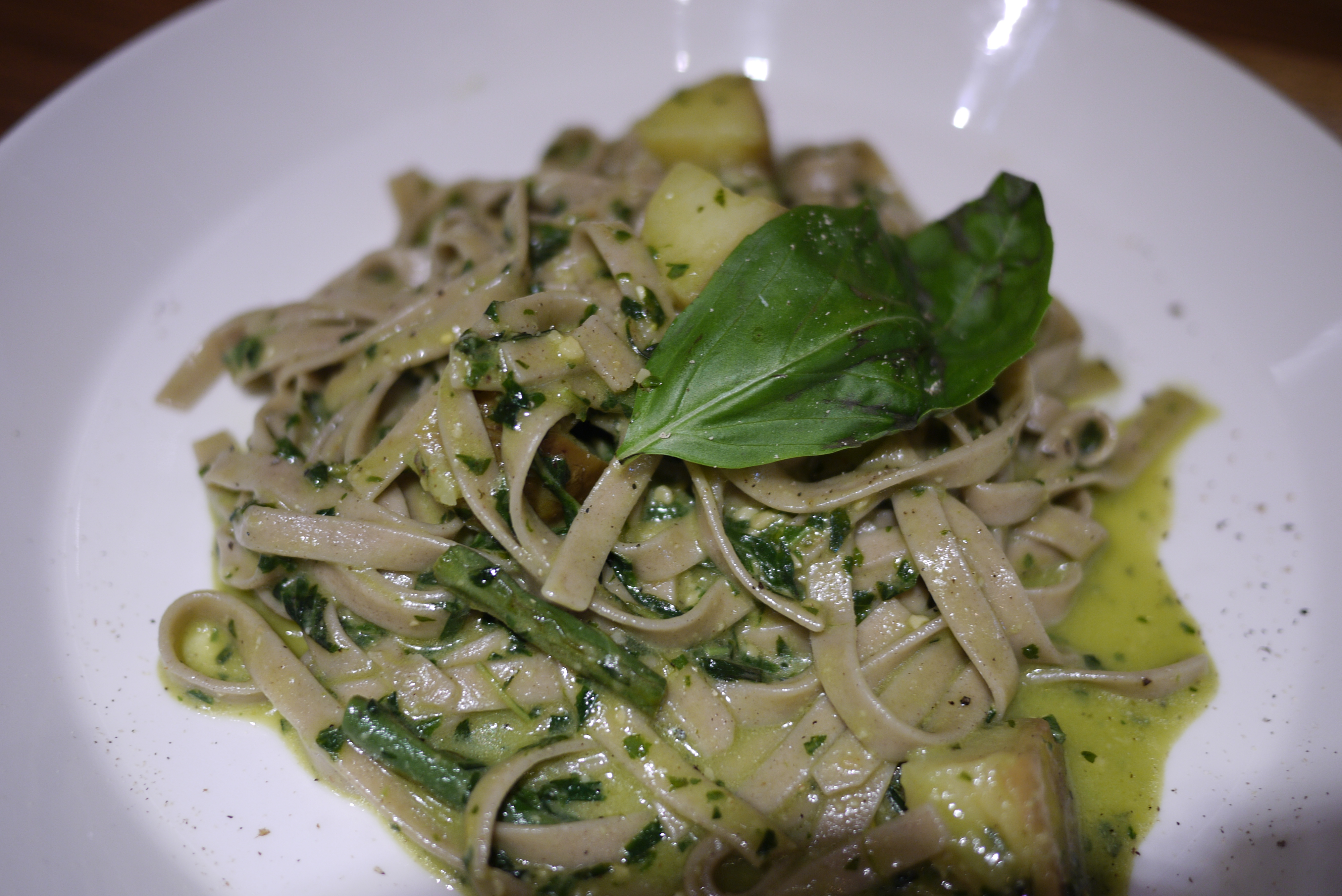 そば粉を使ったパスタは日本人ならほっこりするおいしさ。味付けはかなりしっかりされているので満足度も大。ジェノベーゼの香りがたまらない。