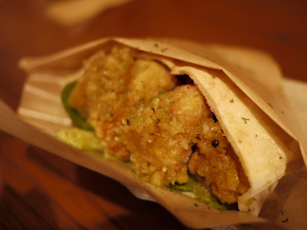 ちょっと控えめのランチや軽食にぴったりなピタパン。具材は3種類あり、好きなものを選べる。これは唐揚げ。中には野菜もたくさん入っている。