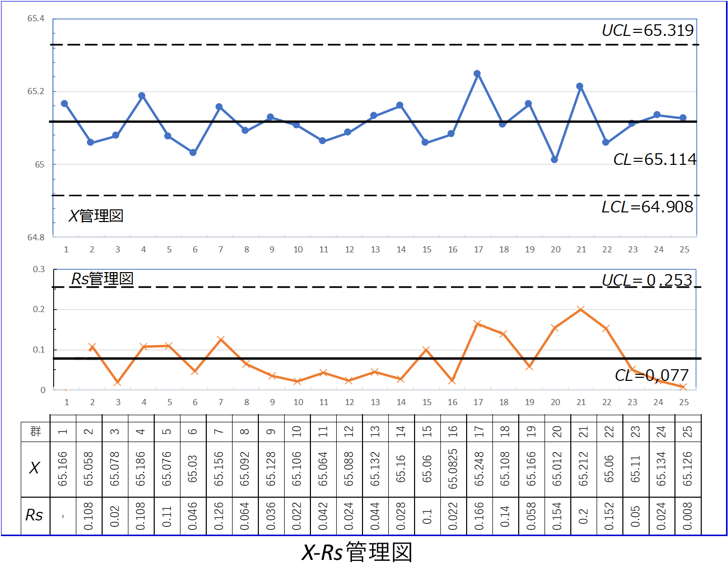 管理図は、データの種類や取り方によって何種類かありますが、ここでは最も簡単なX-Rs管理図を例にして説明します。