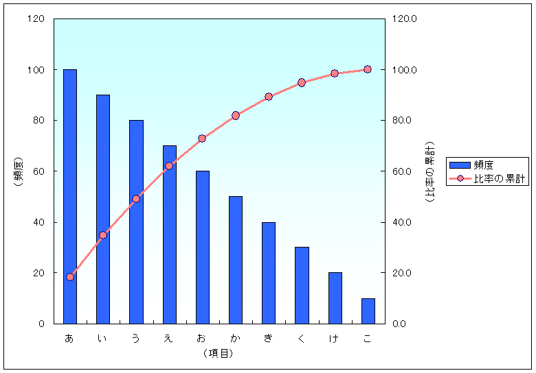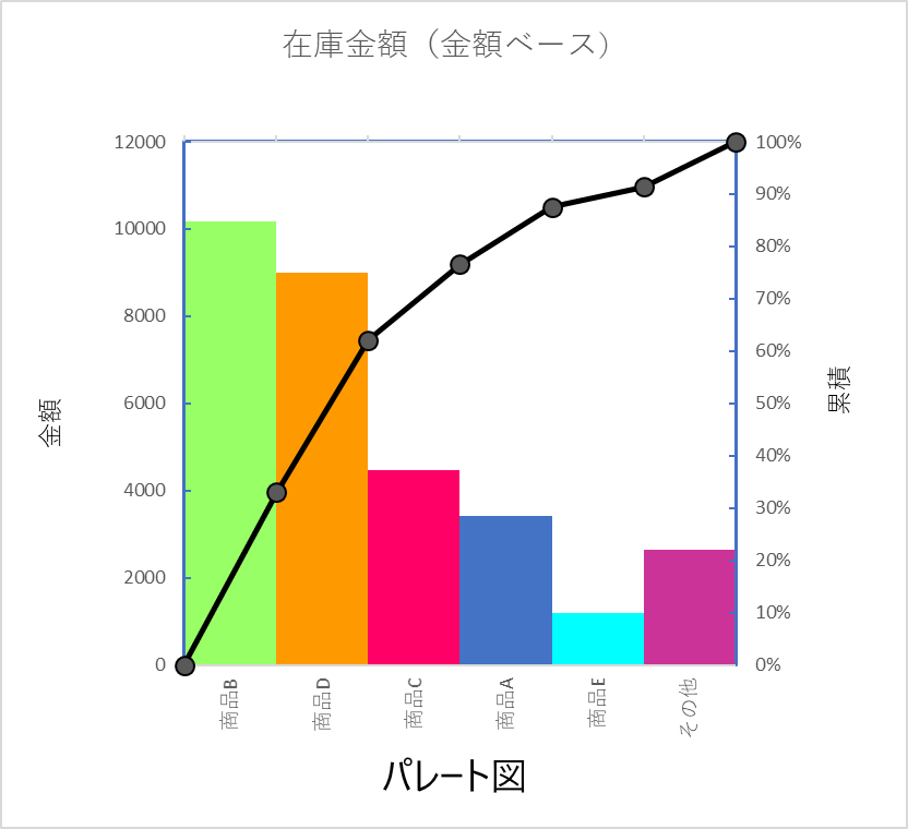 例えば、在庫管理に使う場合は、在庫商品毎の在庫金額、売上高などの指標の中から重視する評価項目を決めて、商品を横軸にして評価項目の数値を縦軸にとって管理します。数値の大きい順に並べて、各商品毎の評価項目の数値を棒グラフで、数値の累計を線グラフで表します。
