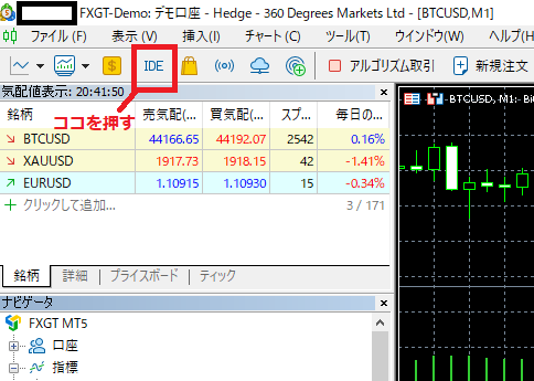 その後、MetaTrader5を立ち上げて、MetaTrader5上からMetaEditor(IDE)を起動します。