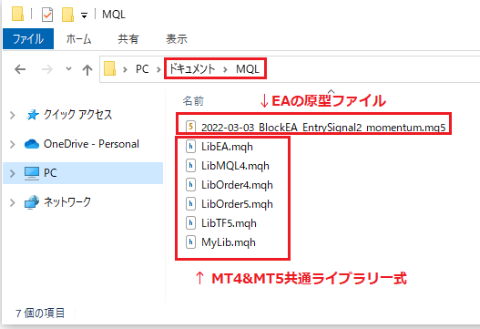 または、「MQL」というフォルダを作って、その中にEAの原型(mql5ファイル。拡張子はmq5) を入れている場合、 「MT4&5共通ライブラリ」 一式を同じ「MQL」フォルダに格納しておく必要があります。以下にスクショ画像を貼り付けました。